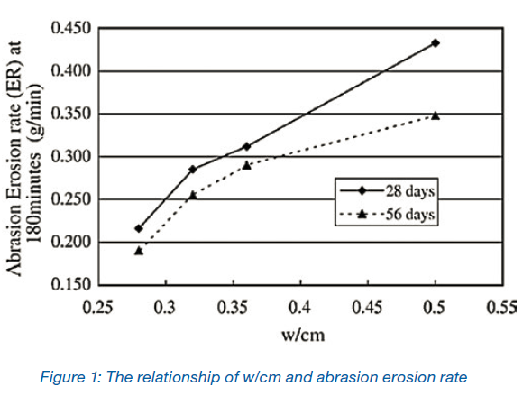 1- A reduction in the w/cm ratio increases the concrete abrasion resistance (Figure 1)