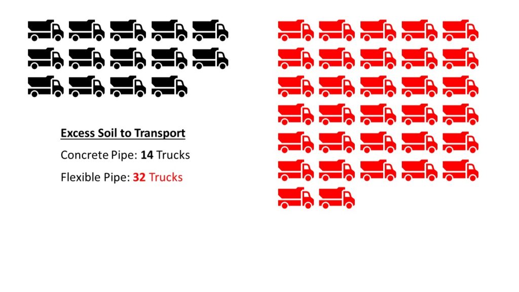 An assessment of these two very different installation details results in a plastic or metal pipe requiring more high quality backfill material and generating more than twice as much excess soil than a concrete pipe.